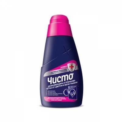 Дезинфекциращ течен препарат ЧИСТО за отстраняване на петна, миризми, бактерии и фунги от цветни и бели тъкани.
