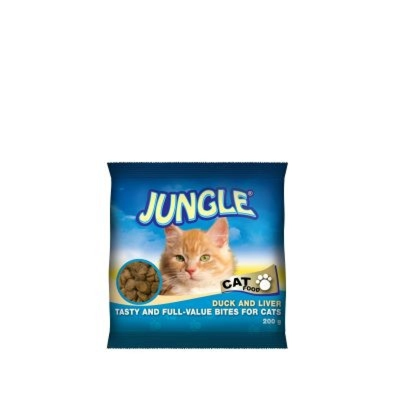 Гранулираната храна за котки Патица и черен дроб на Jungle е пълноценна храна за вашата котка, произведена от висококачествени натурални съставки. Съдържа зърнени продукти, месо и животински субпродукти, преработени пилешки продукти, мазнини, витамини, минерали и антиоксиданти.